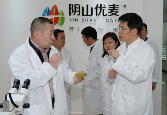 民豐種業(yè)董事長盧文兵對公司近年來的發(fā)展情況以及企業(yè)三產融合的實施布局情況向黃志強副主席進行了詳細的匯報。近幾年,民豐種業(yè)已發(fā)展成為中國集馬鈴薯、燕麥研發(fā)、種子生產、分級加工、物流倉儲、推廣銷售于一體的現(xiàn)代化農業(yè)企業(yè),是農業(yè)產業(yè)化國家重點龍頭企業(yè)、國家高新技術企業(yè)、自治區(qū)扶貧龍頭企業(yè)。子公司陰山優(yōu)麥已發(fā)展成為中國燕麥深加工企業(yè),是自治區(qū)農業(yè)產業(yè)化重點龍頭企業(yè)和自治區(qū)扶貧龍頭企業(yè),所生產的燕麥米、燕麥片、燕麥餐杯、燕麥高纖素等燕麥食品銷往全國二十多個省市,成為百姓餐桌上的大健康食品。子公司蒙薯食品“年產8000噸低溫油炸薯條、2000噸胡蘿卜脆片加工項目”也將于今年投產。